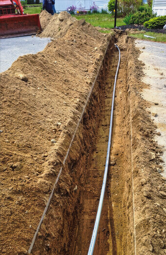 Compliant trenching and electrical-grade conduit installation for mains cabling, including proper backfill, warning tape, and compaction where required.